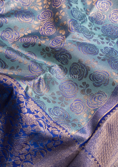 Pastel Aqua Blue Pure Silk Saree with Royal Blue Gold Zari Border kanjivaram saree